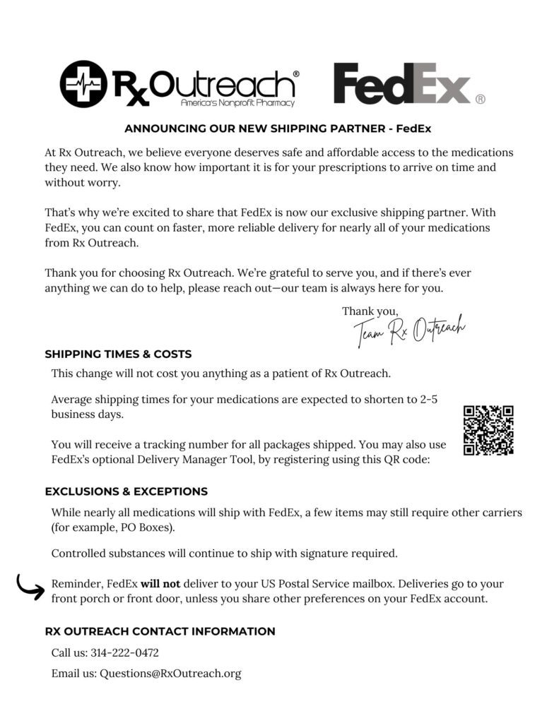 ANNOUNCEMENT September 8, 2025 At Rx Outreach, we believe everyone deserves safe and affordable access to the medications they need. We also know how important it is for your prescriptions to arrive on time and without worry. That’s why we’re excited to share that FedEx is now our exclusive shipping partner. With FedEx, you can…